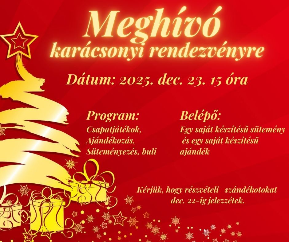 Sok szeretettel meghívjuk minden kedves lovasunkat és hozzátartozóikat 2025. december 23-án kedden 15 órától tartandó karácsonyi partira, amelynek helyszíne az Aranyménes Lovarda.